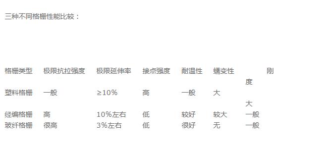 (1)土工格柵的極限抗拉強(qiáng)度從高到低排列依次是玻纖格柵、經(jīng)編格柵、塑料格柵,而極限延伸率從高到低排列依次是經(jīng)編格柵、塑料格柵(經(jīng)編格柵的延伸率視原材料有較大變化范圍,有的可能比塑料格柵的小)、玻纖格柵。玻纖格柵沒有蠕變性。