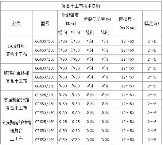 由120G的土工布和50Kn的玻璃纖維土工格柵或滌綸土工格柵復(fù)合。另:土工布和土工格柵的具體型號可以視要求定做。土工格柵的寬度為1m-6m。