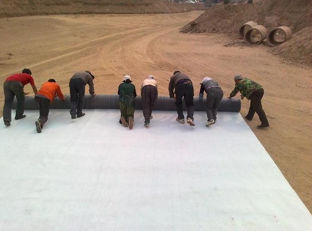 4)膨潤土復(fù)合防水墊(GCL)搭接面不得有沙土、積水(包括露水)等影響搭接質(zhì)量的雜質(zhì)存在。